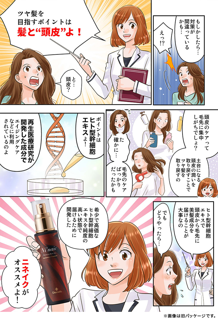 - 一般的なヘアオイルは、髪のダメージを補修したり、ツヤを出す成分を与えるものです。これに対し、『ニネイク』は若々しい美肌の源である「ヒト型幹細胞エキス*」に着目。美しく健やかな髪を保つ土台となる「ヒト型幹細胞エキス*」をはじめとする美容成分や植物性オイルを奥までダイレクトに届けることで、頭皮から髪のダメージを補修し、髪本来のサラサラ感、ツヤ感、まとまり感を実感することができ、誰もがうらやむ美髪へ導きます。